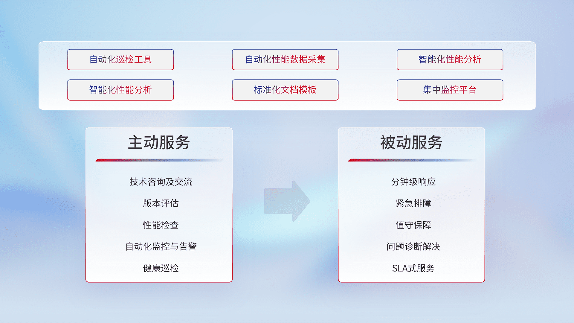 智能化工具和标准化文档,,保障服务质量,,,提供主动服务(包含技术咨询、、版本评估、、、性能检查、、、、自动化监控与告警、、健康巡检)和被动服务包含(分钟级响应、、、紧急排障、、值守保障、、、问题诊断解决、、SLA服务)。。。
